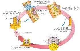Reprodução Sexuada: A maior parte das esponjas é hermafrodita, ou seja, possui dois sexos. Os gametas são formados em células chamadas gonócitos- células reprodutoras primordiais,que são derivados dos amebócitos (células que agem como fagócito e ajudam na assimilação e excreção). Os espermatozóides saem da esponja pelo ósculo e penetram em outra esponja pelos poros, junto com a corrente de água. São captados pelos coanócitos (células endodérmicas coanadas e flageladas que revestem a cavidade de uma esponja) e transferidos até os óvulos, que ficam na mesogléia (folheto não celular de consistência gelatinosa,existente entre o exoderma e o endoderma) e promovem a fecundação. A maioria das esponjas é vivípara,ou seja,completamente desenvolvidas e capazes de viver de forma independente, depois da fertilização o zigoto é retido e recebe nutrientes da esponja parental até que uma larva flagelada seja liberada, que nada até se fixar em um substrato e dar origem a um novo indivíduo.